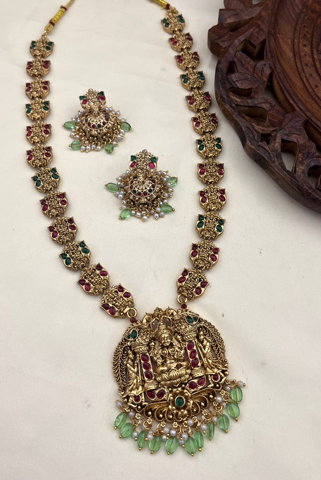 Adorn yourself with the divine elegance of this single long temple necklace set. Crafted in a heritage antique matte gold finish, the centerpiece is a grand pendant featuring the Goddess Lakshmi motif, intricately decorated with vibrant synthetic Rubies (Red) and Emeralds (Green), and accented with delicate light green bead drops. This is a stunning, singular piece that brings traditional charm to any occasion