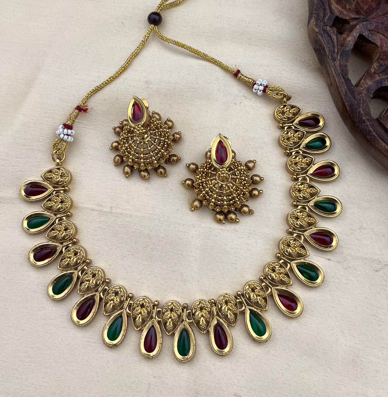 Set Components: 1 Short Choker, 1 Long Haram Necklace (with adjustable dori), and 1 Pair of Matching Stud Earrings.
